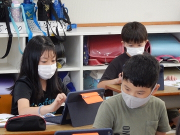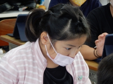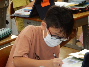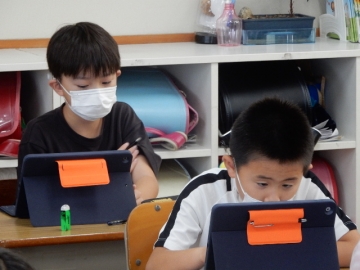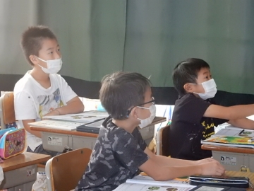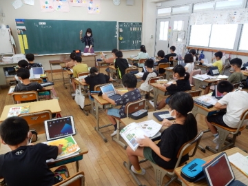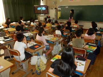 2年の子どもたちが、植物の一生について学習していました。教科書の写真や市販のビデオだけでなく、自分たちが育てたホウセンカなども題材に使って考える展開です。子どもたちは、細かいことまでよく覚えていて、授業者の問いかけにしっかりと応じていました。