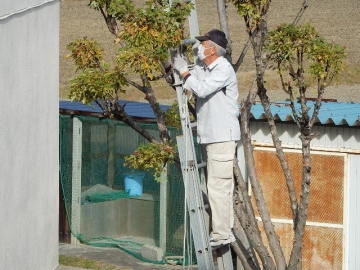 寒風が強く吹く季節になりました。今日も、学校用務員の2人は運動場や校庭、学級園などの手入れを行っていました。本校は、敷地が広い上にたくさんの樹木などが植えられているので、年間を通して計画的に行う必要があります。