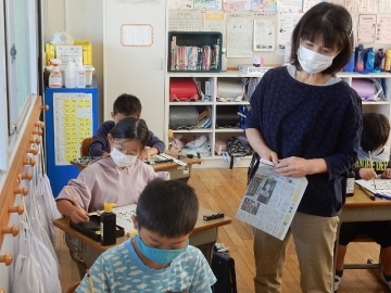 小筆を使って、自らの名前を書く練習を行っていました。筆は、鉛筆より立てて持つことも上手く書くコツの一つです。書いているうちに鉛筆の持ち方に変えてしまう子もたくさんいました。