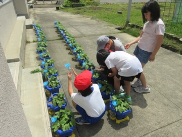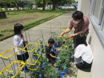 2年生が育てているナスやキュウリもぐんぐん生長するので、支柱を立てています。