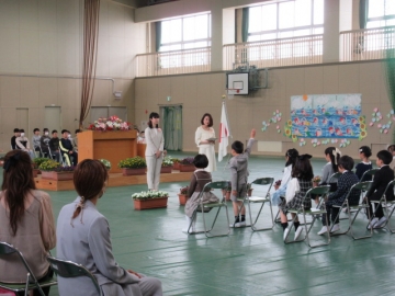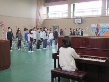 6年生が、校歌を歌います。新1年生のみなさんも、すぐにおぼえて、一緒に歌えるようになりますよ。