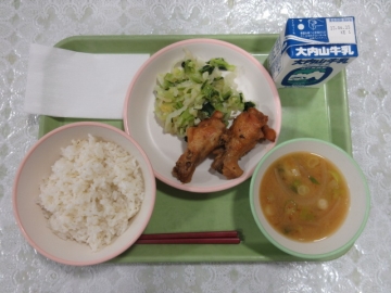 ・むぎめし ・とりにくのさっぱりに ・たくあんのあえもの ・みそしる ・牛乳
