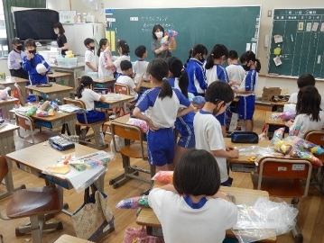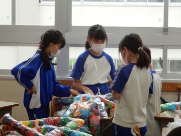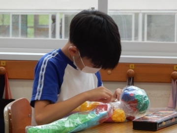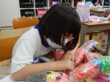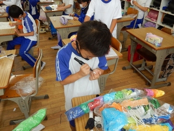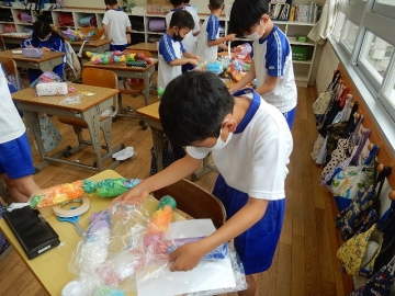 3年の子どもたちが、様々な色の花紙と透明なビニール袋を使って“友だち”を作っていました。単元「カラフルフレンド」の活動です。ある子の“友だち”は2つの頭をもつ怪獣(?)でした。