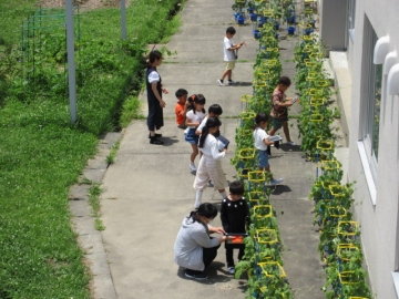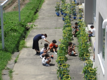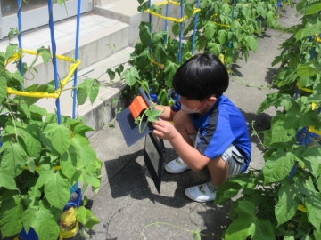 たぶれっとを つかって、あさがおの はなや つぼみを きろくします。