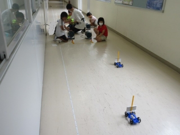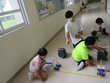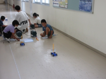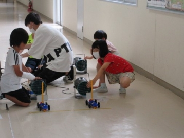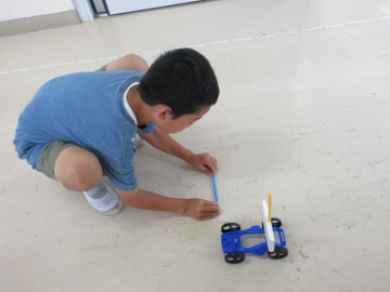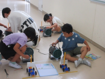 風で動く車を使って、今から実験です。風を「強くした時」と「弱くした時」では、車の動くきょりはどう変わるでしょうか。