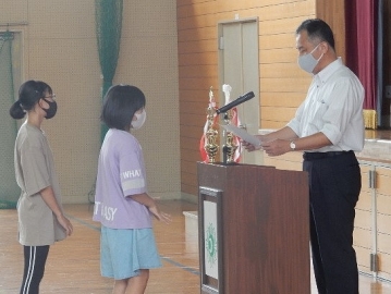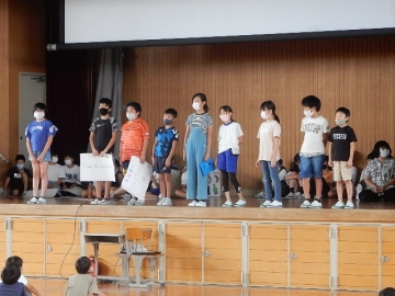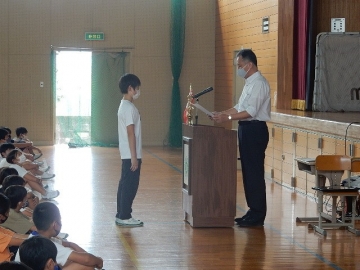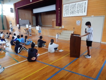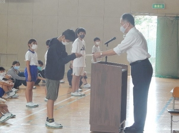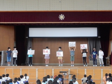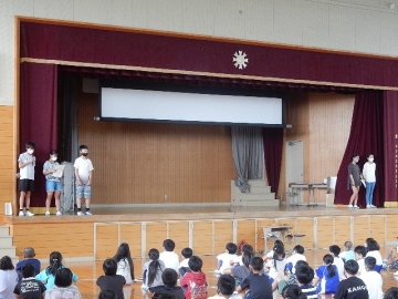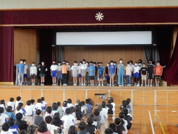 伝達表彰と任命式、児童集会を行いました。全ての子どもたちが体育館に集まる催しは、学校生活が再開されてから初めての実施です。館内を大きく使って、互いに距離を取りながらの開催でした。