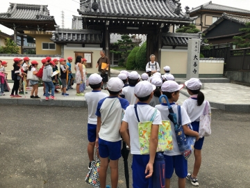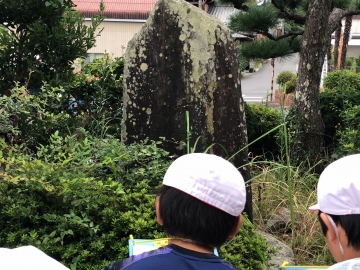 3年生は、総合的な学習の時間を使って「神戸の歴史」を学んでいます。今日は、1学期に学んだ内容の現地を訪れました。河合魯斎顕彰碑と大善寺、おこし古墳、神戸乃神社、新光寺です。1学期もお世話になった藤波さんと黒川さんが案内してくださいました。