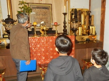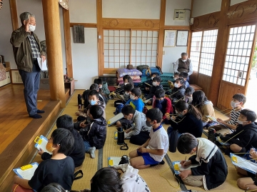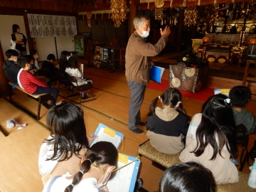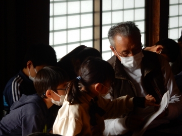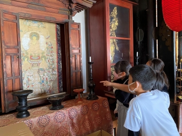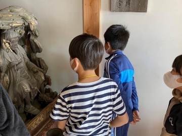 3年の子どもたちは、総合的な学習の時間に校区の歴史を学習しています。今日は、神戸地区にお住いの黒川さんと内藤さんに案内してもらって、貞観寺と新光寺がそれぞれに所有してみえる曼陀羅図や神戸出張所に設置されている河合魯斎碑などを見学してきました。お二人から詳しく説明してもらって、「三重県に生まれて良かったな。」や「神戸に生まれて、やろ。」などと言い合っている子どもたちもいました。