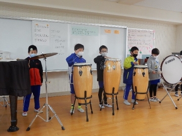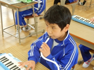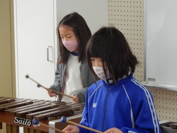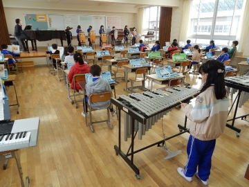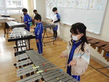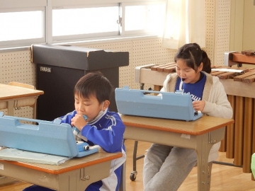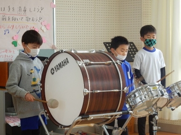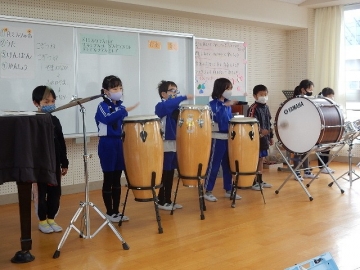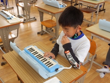 2年の子どもたちが、鍵盤ハーモニカや打楽器などを使って「こぎつね」の曲を演奏していました。新型コロナウイルス感染の流行状況を考え、マスクを取っている時の会話は厳禁です。子どもたちは、曲がもつ感じを生かして丁寧に演奏していました。