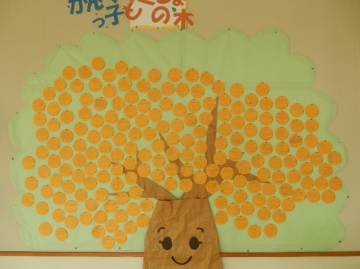 9月の下旬に設置した「かんべっ子『どくしょの木』」がもうすぐ満開です。2階のホール前廊下を通りかかる度に、少しずつ増えていく子どもたちの花(実かも?)を愛でて(読んで)います。