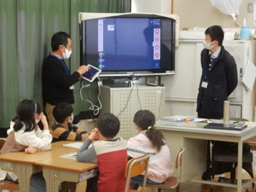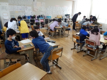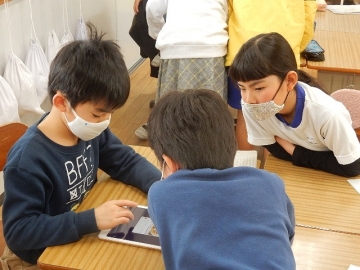 3年の子どもたちが、タブレット型パソコンやロイロノートなどの使い方を習っていました。子どもたちは授業を行う程に様々な操作方法を得とくしています。今回は、文書に貼り付ける画像もウェブサイトのフリー素材を使っていましたし、書き添えるコメントもローマ字を使っていました。