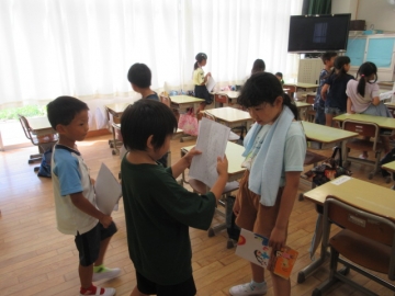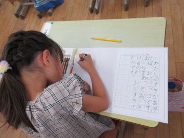 きいてくれるひとを じぶんでみつけて、「わたしのすきなあそび」を つたえます。よむぺぇじの はんがいがわに えも かいてあるので、とても わかりやすいですね。