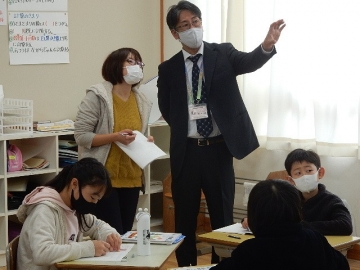 本校は、教員の授業力がさらに向上するよう、授業を互いに提案し合って協議する校内研修に取り組んでいます。今日は、5年の算数を担当している青木先生が習熟度別授業を高学年部に所属する教員などに提案しました。道のりと時間、速さの関係を考える内容の授業です。ペア活動やグループ活動が大半の時間を占める展開ですが、いつものことなので、子どもたちもスムーズに思考していました。