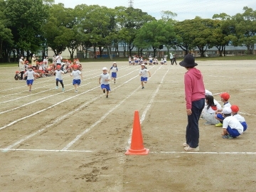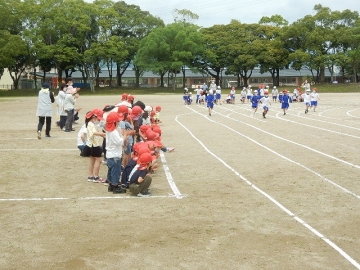 隣接する津みどりの森こども園の子どもたちが、運動会の練習を行っている1年と2年の子どもたちを応援しにきてくれました。一緒に通園していた子も多いらしく、たくさんの拍手とともに「〇〇くん、がんばれぇ。」などの声援もかかります。本校の子どもたちも、張り切って走っていました。