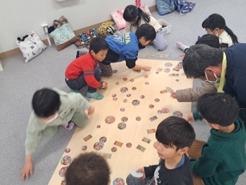 「めんこ」「こままわし」「けんだま」「竹ぽっくり」のコーナーを、じゅんばんに まわって あそびます。