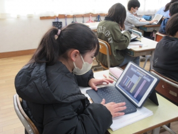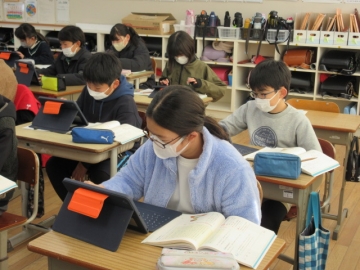 「はじめ」「中」「終わり」の展開をふまえ、シンキングツールを使って、意見文の構成を考えています。