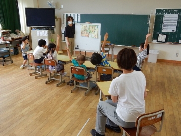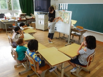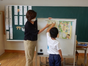 教材「おかしく ないかな」を使った学習でした。絵に描いてある子どもたちの振る舞いから社会生活のルールやマナーなどを学ぶ内容です。子どもたちは、しっかりと考え、自らの言葉をそれぞれの発言に重ねていました。
