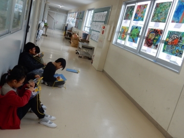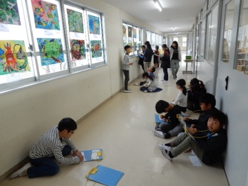 作品展が終わったので、みんなの作品を鑑賞しています。「ぼくの作品みて」「このモンスターは、生き物の中にも入って寄生するんやに」などなど、誇らしげに作品を紹介してくれました。自分の作品への満足感が満ち溢れていました。