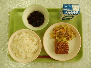 今日は、1月の節句料理にちなんだ給食でした。献立は、松風焼きと黒豆煮、ごぼうの和え物、麦飯、牛乳です。子どもたちは、食教育を担当する教員から松風焼きと黒豆、ごぼうのそれぞれに込められている願いなどを紹介してもらっていました。