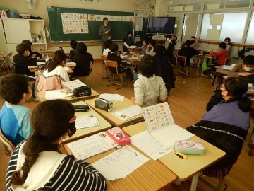 6年の子どもたちが、これまでに習った曜日や月、100までの数、教科などの英単語を使って、チャンツゲームを行っていました。「少しずつ積み重ねて、たくさんの英単語を習ってきたなぁ。」と思いながら、しばらく参観していました。