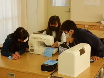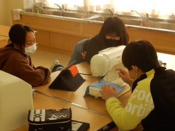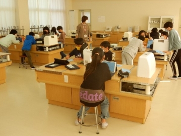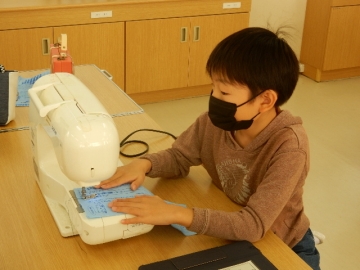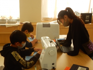 家庭科室に立ち寄ったら、5年の子どもたちがミシン縫いを行っているところでした。初めてミシンを使う子がほとんどだそうです。順番を待っている子どもたちは、それぞれに縫っている子の動作をジッと見たり「あぁ、ドキドキするぅ。」などと言ったりしていました。