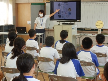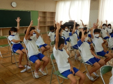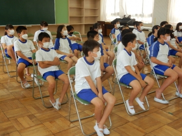 2学期の身体測定では、全学年、まず養護教諭の坂口先生から、「すいみんについて」のお話を聞きます。