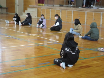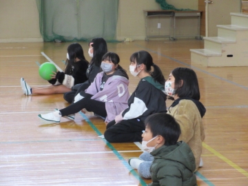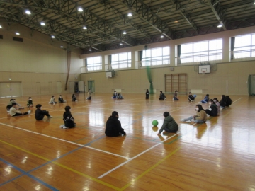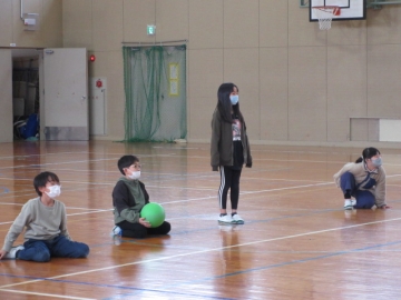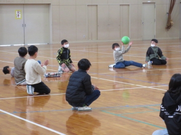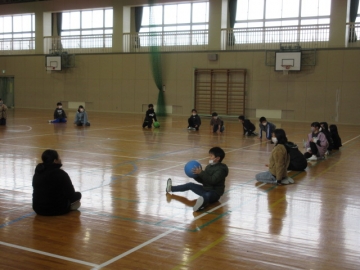 体育館での「お楽しみ会」です。ドッジボールを2こ使った、「ばくだんゲーム」です。