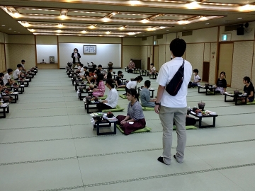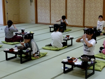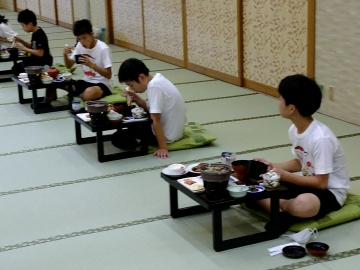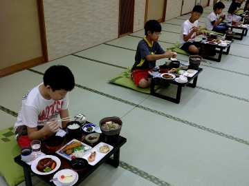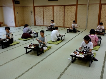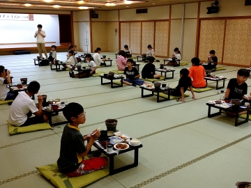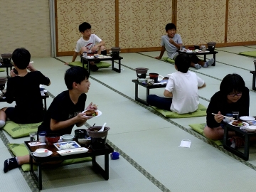 お待ちかねの夕食です。本年度は、新型コロナウイルス感染症が流行しているため、子どもたちが座る席の間隔を広く取ったり、ご飯のおひつなどを共用しなかったりしています。いずれにしても、