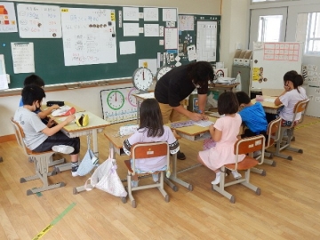 以前に習った時刻や時間の内容を復習していました。文章問題の内容によっては、日常生活の経験値などを要する場合もあります。子どもたちが前向きに取り組むので、授業者も大忙しのようでした。