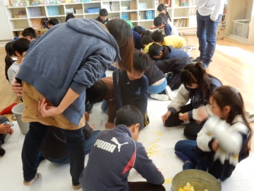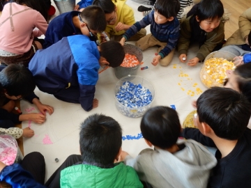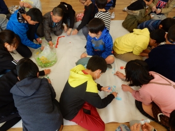 巨大な貼り絵をみんなで作っていました。どんな絵になるんだろう。