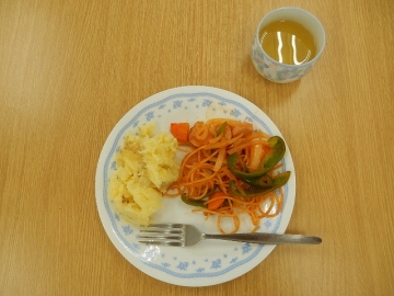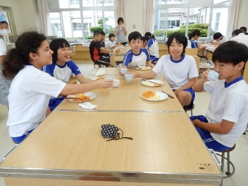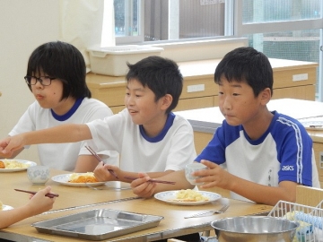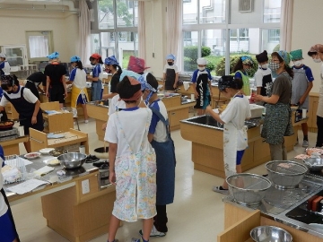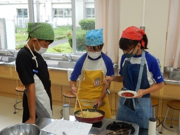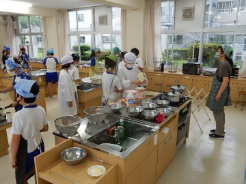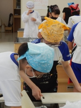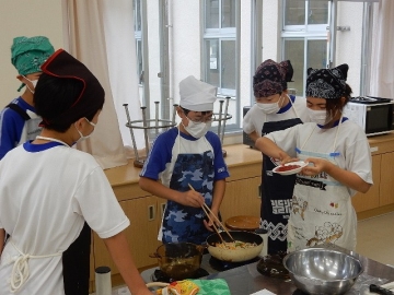 6年の子どもたちがスパゲティナポリタンとポテトサラダを作っていました。直火を使うので、室温が少し高くなりますが、全員がマスクを着用したままの調理です。子どもたちの手際が良く、調理が予定より早く終わって、授業者も感心していました。