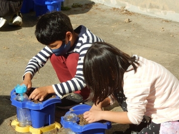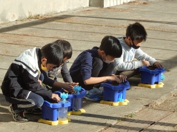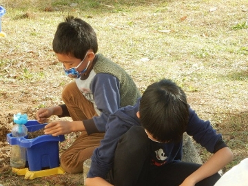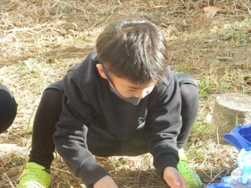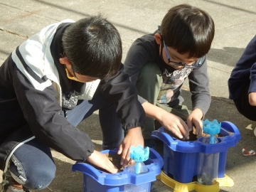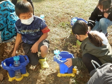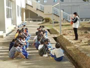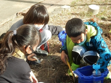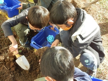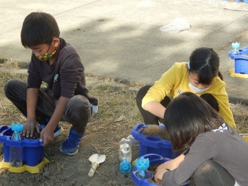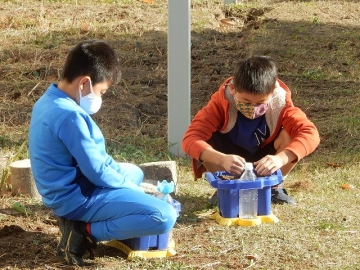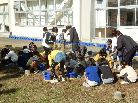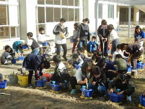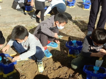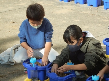 2年の子どもたちが、外に出てチューリップの球根を植えていました。それぞれが、学級園の土を鉢に入れ、自らが選んだ色の花が咲く球根を植える作業です。子どもたちの和気あいあいな雰囲気は、今日の穏やかな冬晴れのようでした。
