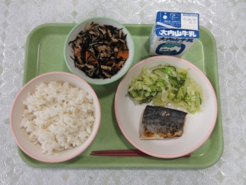 ・むぎめし ・サワラのてりやき ・あさづけ ・こうやどうふとひじきのにもの ・牛乳