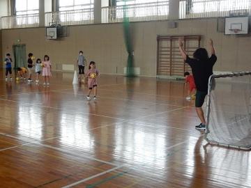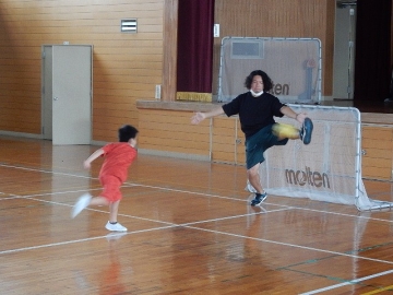 ハンドボールのシュート練習を模した活動を行っていました。ゲーム性もあって、楽しく運動することができます。ゴールキーパー役を務めた授業者は大変そうでしたが…。