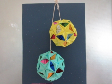 としょかんの いりぐちに、とてもきれいな「まり」が、かざってありました。