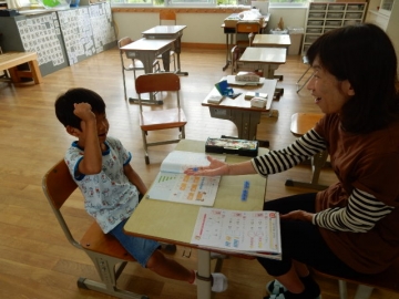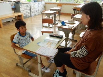 1年生の算数は、「いくつといくつ」を学習中。今日は、学習ルームで先生と一対一で学んだことを復習しています。