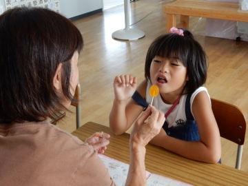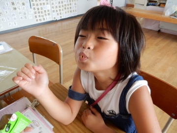 「シ」「ス」などの発音がしっかり出ないので練習をしています。練習グッズもすごいです。空気がもれないようにペットボトルを加える練習。小さいリングのおかしをくちびるの先にくわえて、「ス」という練習。などなど。工夫がうかがえます。