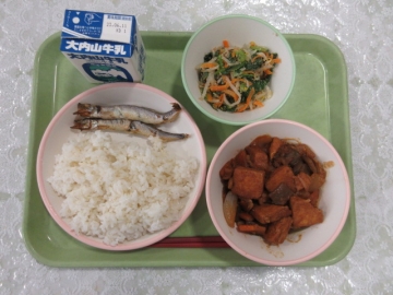 ・むぎめし ・やきししゃも ・あつあげのみそいため ・ごまずあえ ・牛乳