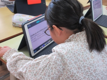 お友達と待ち合わせる場所を、電話で伝えます。どう言えば伝わるかグループで相談しながら、タブレットに入力しています。