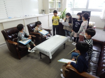 1年の子どもたちが校内を探検しました。1年を職員室や各特別教室などに案内する係や各所において説明する係の全ては、2年の子どもたちが分担しています。それぞれが、気を配りながら案内したり、分かりやすく説明したりしていました。これも「かんべっ子」の成せることです。