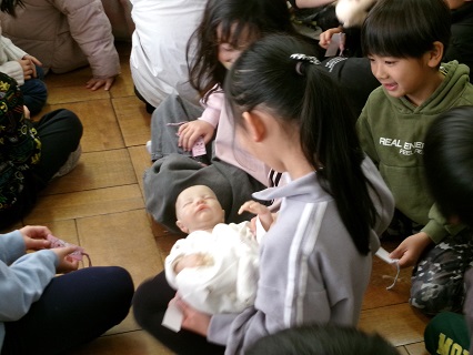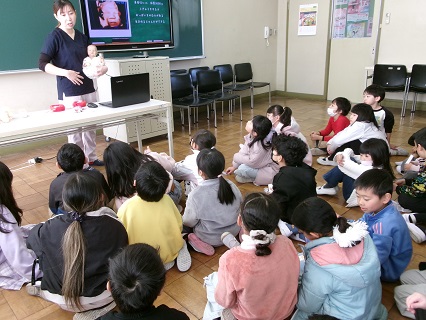 2月10日(火)に助産師の朴木さんに来ていただいて、1・2年生対象に命の授業をしていただきました。まず初めに助産師の仕事について説明していただきました。次に、命のはじまりである受精卵のことや、おなかの中で胎児がどんなふうに大きくなっていくかということを話していただきました。命が誕生するまでの母親や家族の思いや命がけで出産にのぞむ母親とともに、赤ちゃん自身も頑張って生まれてきたこと、多くの人の祝福があって生まれたことも話していただきました。生まれてきたことは、まわりの人たちを幸せな気持ちにしてくれたのだということなど一人一人の自尊感情を高められるような内容でまとめをしていただきました。また、赤ちゃん人形を抱かせていただいたり、出産のビデオを視聴させていただいたりしました。授業の感想の中で「お母さんががんばって自分を生んでくれてうれしい」という意見が出ました。