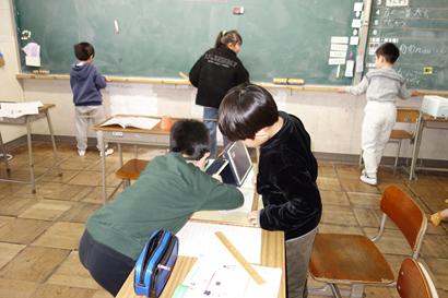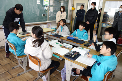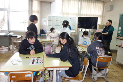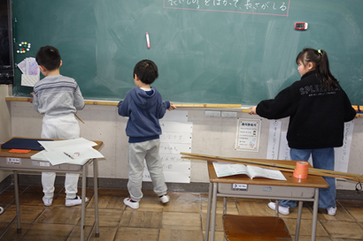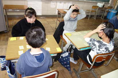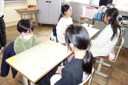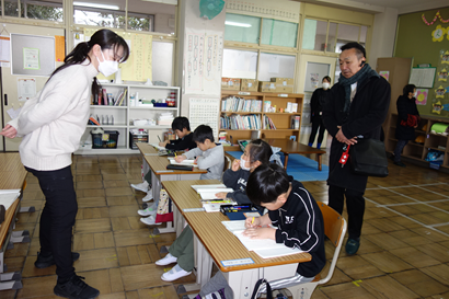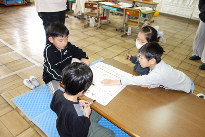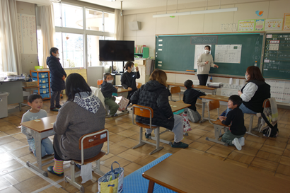 来年度入学予定の子どもたちが、小学校に来てくれました。2限目は、1年生と一緒にひらがなを書いたり、数字を読んだりしたあと、ドングリゴマやマラカス、マツボックリのけん玉などを作ったり遊んだりしました。業間休みには、4・5年生と一緒に運動場で元気に遊びました。そのあと、4・5年生が校舎内を案内しました。最後に体育館でしっぽとり鬼ごっこをしました。 みんなで仲良く楽しく過ごせたね。4月に新1年生が入学するのを小学校のお友だちは楽しみに待っているよ~。