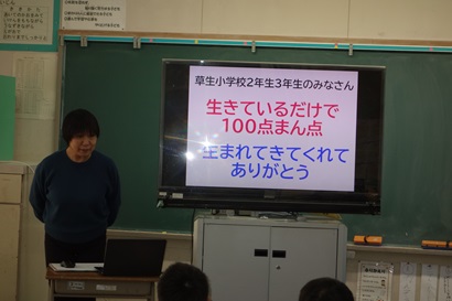 小学生ライフプラン事業として、2・3年生が『生きてるだけで100点満点』というテーマで、いのちの授業をしていただきました。子どもたちが生まれてきたときの家族の思い、赤ちゃんがおなかの中で育っていく様子などをクイズや映像を交えて話していただきました。また、「自分らしさ」の捉え方や「プライベートゾーン」、「パーソナルスペース」なども教えていただきました。いのちの尊さを十分感じることができる授業となりました。