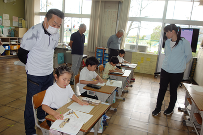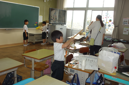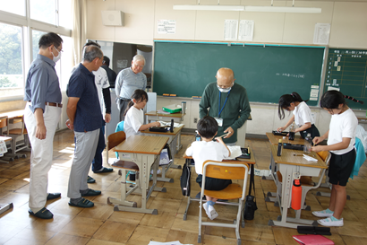 綿づくり名人にゲストティーチャーとしてご来校いただき、1年生が綿の種取り機を使って綿から種を取り除く方法を教えてもらいました。機械を使うと素早く綿から種を取り出せることに驚いていました。