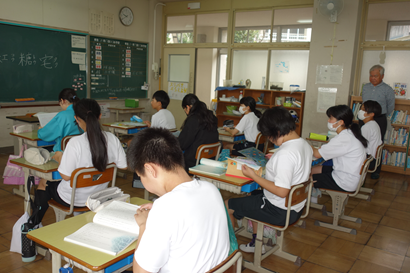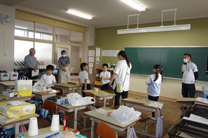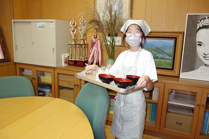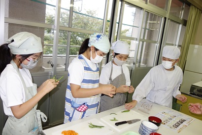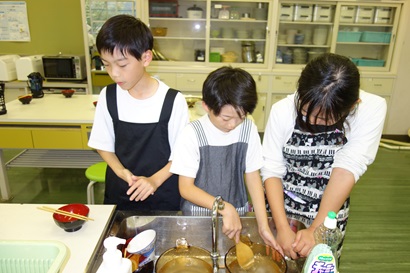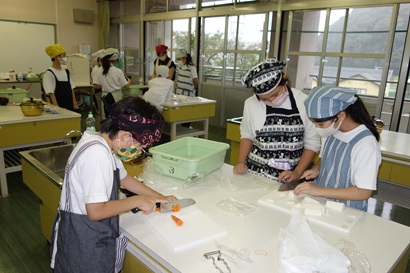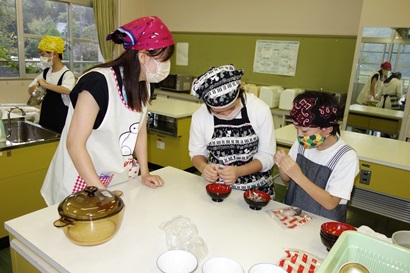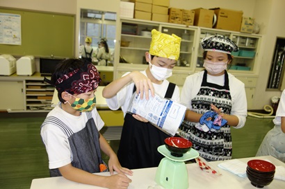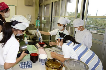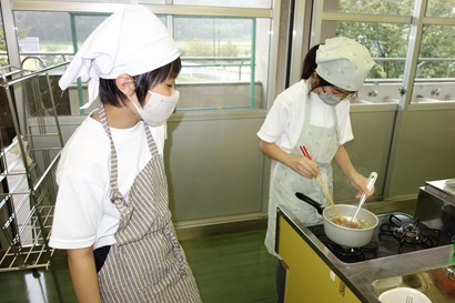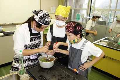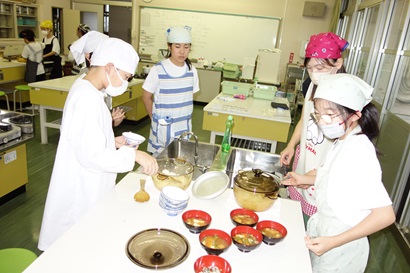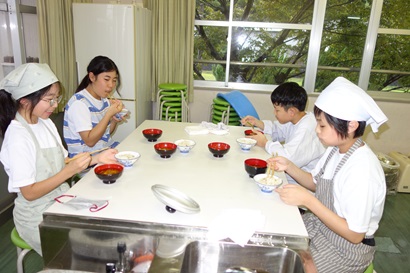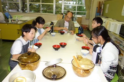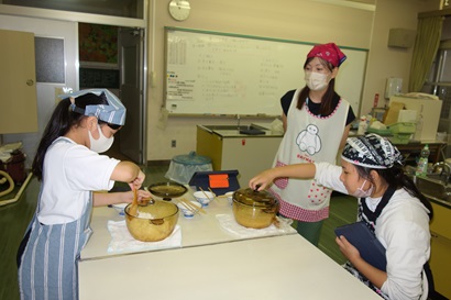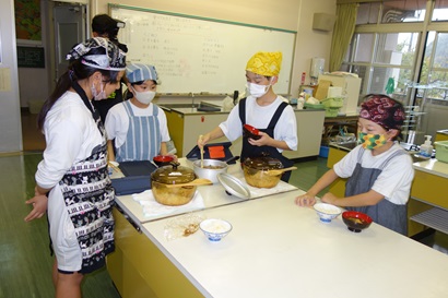 5年生が、家庭科の調理実習でご飯と味噌汁を作りました。味噌汁は、煮干しでダシを取り、各自が持ち寄った具と学校で育てたインゲンを入れました。ご飯は、鍋で火加減を調節して炊き上げました。グループで協力して、おいしいご飯と味噌汁を作ることができました。