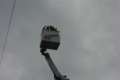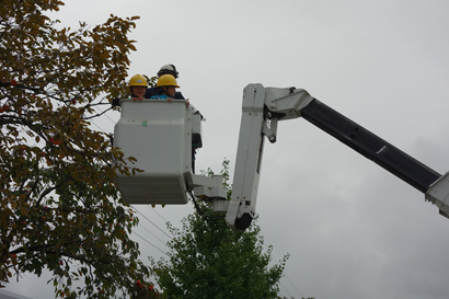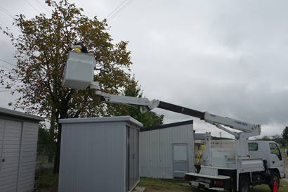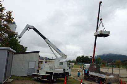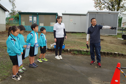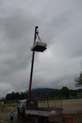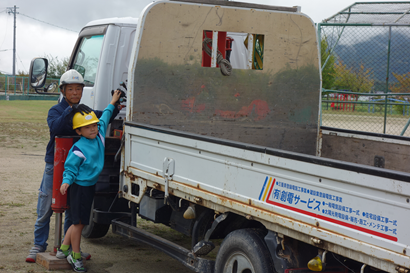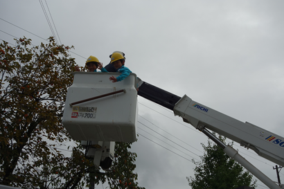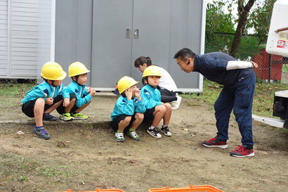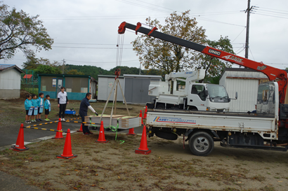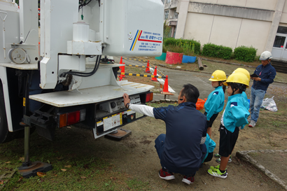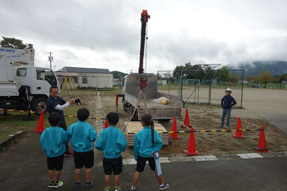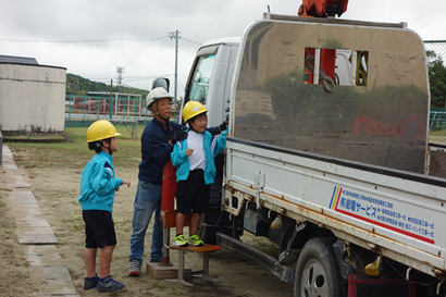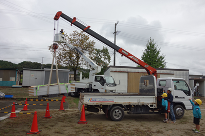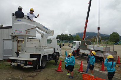 1年生が、「じどう車くらべ」の学習で、高所作業車とクレーン付きトラックを地域の方に見学させていただきました。高所作業車の作業床(バスケット)に乗せていただいたり、クレーン付きトラックのクレーンを操作させていただいたりしました。また、車の特徴も教えていただきました。実際に見たり、聞いたり、体験したり、どきどきわくわくがいっぱいの学習となりました。