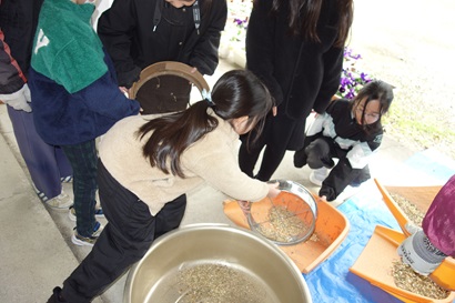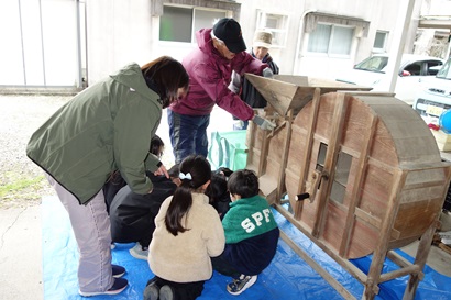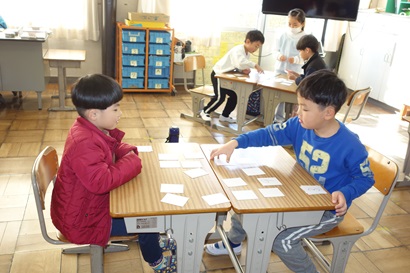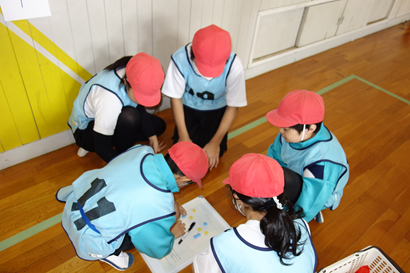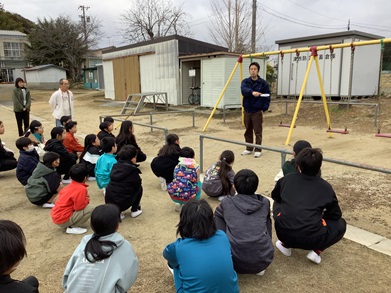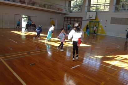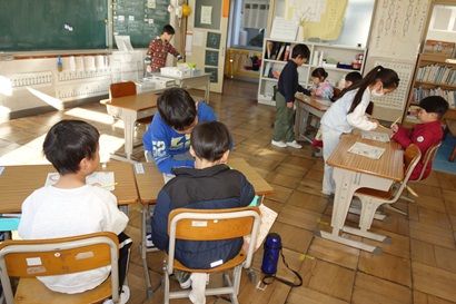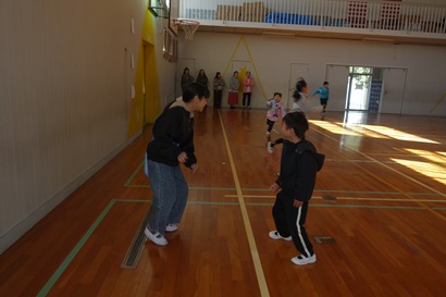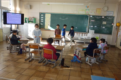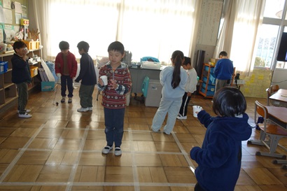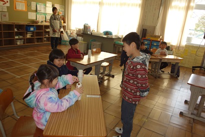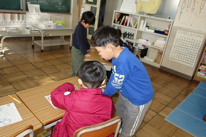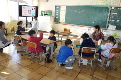 来年度入学予定の子どもたちが、小学校に来てくれました。2限目は、1年生と一緒にひらがなを書いたり、数字を読んだりしたあと、ドングリゴマやマラカス、マツボックリのけん玉などを作ったり遊んだりしました。業間休みには、4・5年生と一緒に運動場で元気に遊びました。そのあと、4・5年生が校舎内を案内しました。最後に体育館でしっぽとり鬼ごっこをしました。 みんなで仲良く楽しく過ごせたね。4月に新1年生が入学するのを小学校のお友だちは楽しみに待っているよ~。
