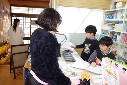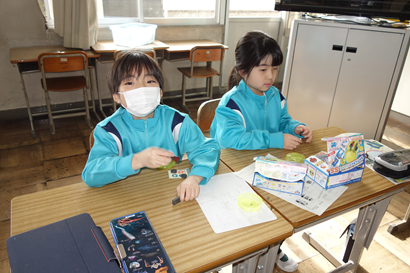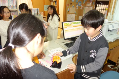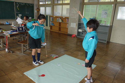 生活科の時間に2年生が、1年生をおもちゃランドに招待してくれました。手作りおもちゃの遊び方を教えてくれたり、一緒に遊んだりして、楽しい時間を過ごすことができました。