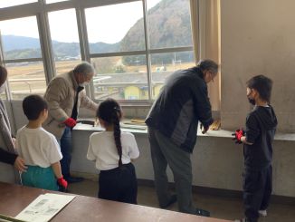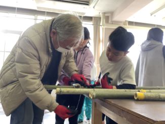 地域の和楽会と社会福祉協議会安濃支部の方々にご協力いただき、竹を切るところから完成するまでの作業を経験しました。