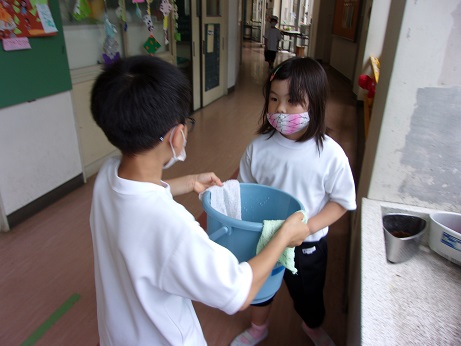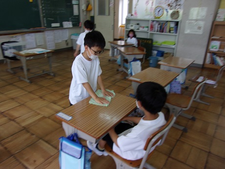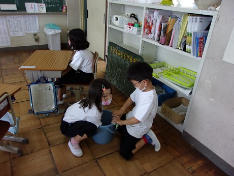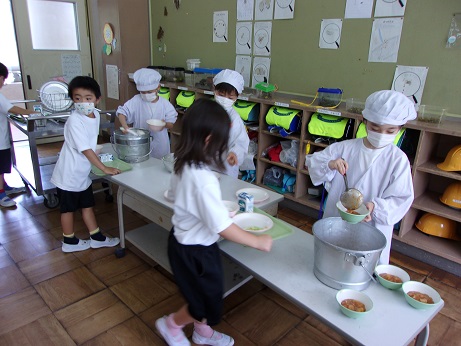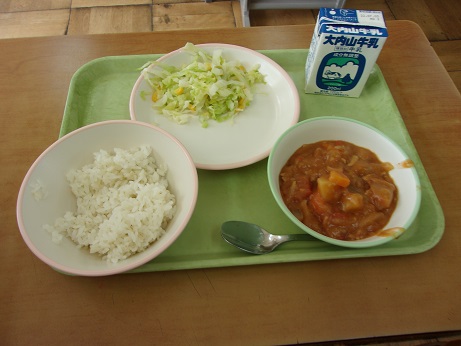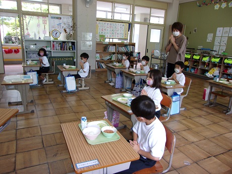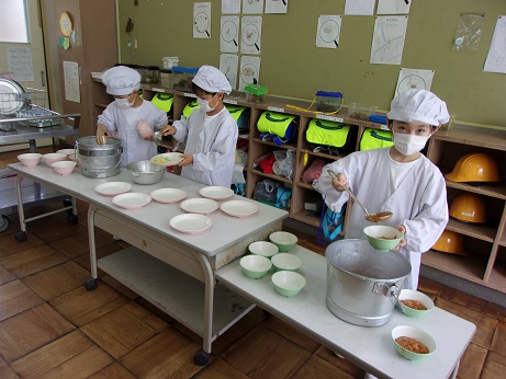 1年生の児童が 「ハヤシライス大好き」とうれしそうに話してくれました。コロナ禍のため、給食は黙食をしなければならないのでちょっと残念ですが、それでもみんな給食の時間を楽しみにしています。「今日はおかわりあるかな」「牛乳が苦手で最初は一口しか飲めなかったけれど、全部飲めるようになったよ」「牛乳パックを一人で開けられるようになったよ」などいろいろ教えてくれました。給食の配膳や片付けも自分たちでしています。みんながんばっているね。これからも好き嫌いなく食べよう。